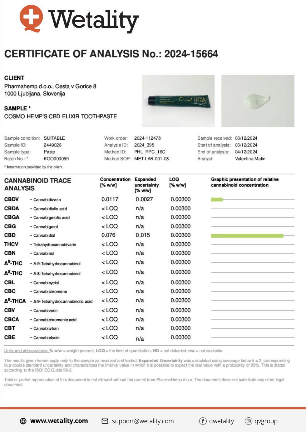 Ingredienser: Aqua, Xylitol, Hydrated Silica, Sorbitol, Glycerine, Betaine, Poloxamer 407, Aroma, Titanium Dioxide, Polysorbate 20, Hydroxypropyl Methylcellulose, Cellulose Gum, Olea Europaea Leaf Extract, Cannabis Sativa L. Extract, Allantoin, Sodium Fluoride, Disodium Edta, Sodium Saccharin, Sodium Benzoate, Ci 75815.