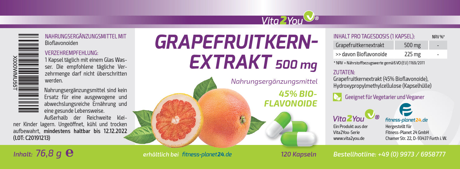 Grapefrugtkerne-ekstrakt, 500 mg (45% flavonoider), 120 kapsler, Vita2you