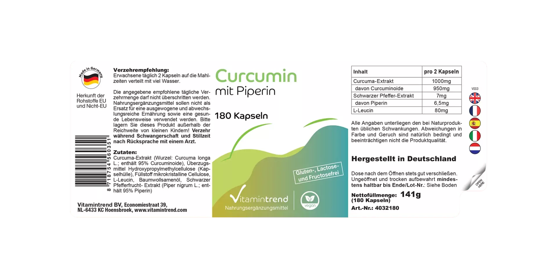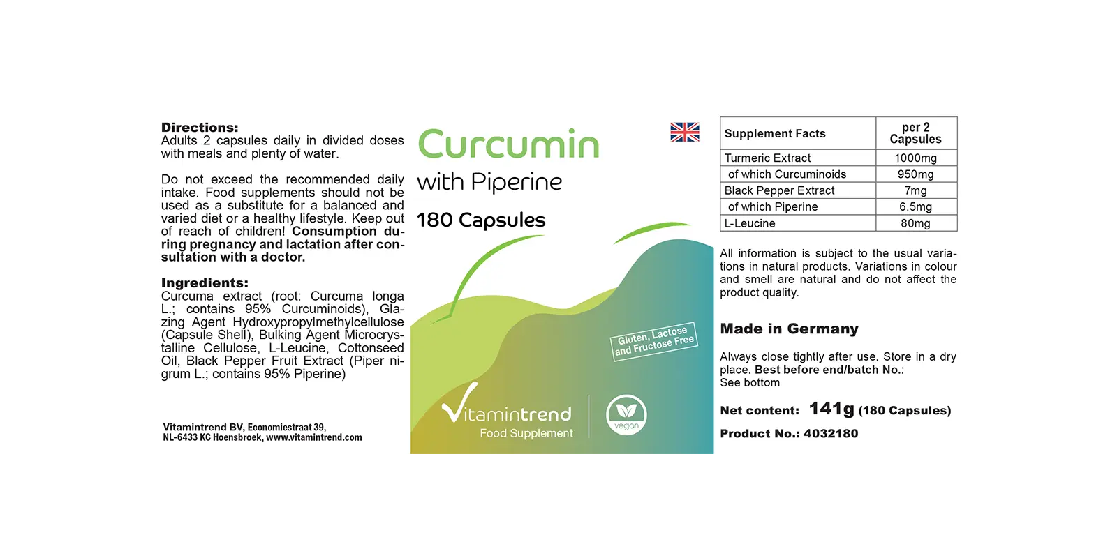 Gurkemejeekstrakt med bioperin, 500 mg (85% curcuminoider), 180 kapsler, VitaminTrend