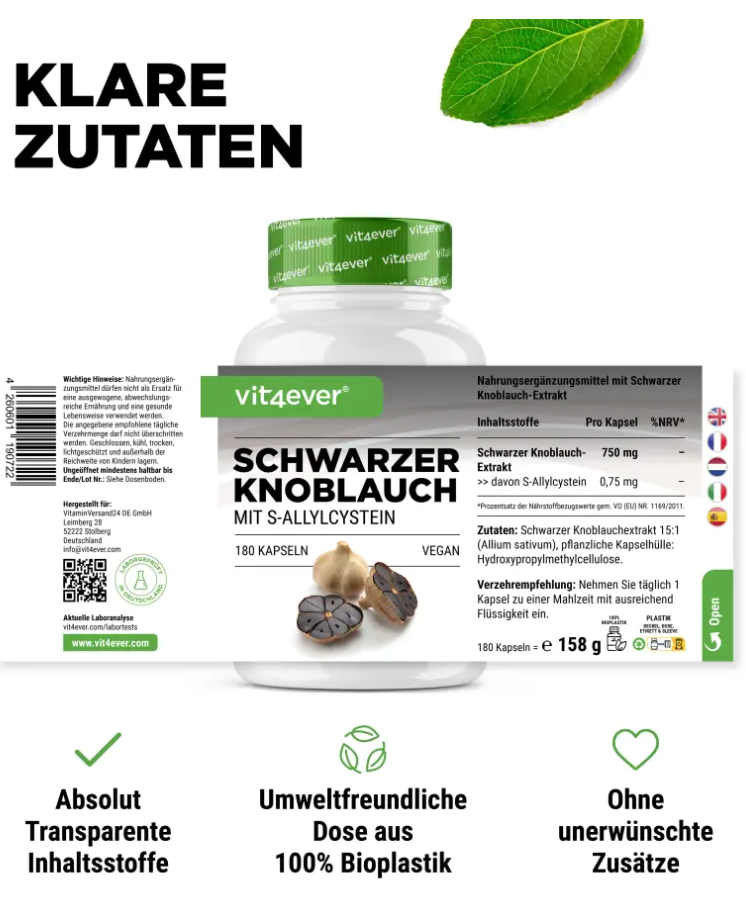 Sort hvidløgsekstrakt, 180 kapsler med 750 mg, 0,75 mg SaC, Vit4ever