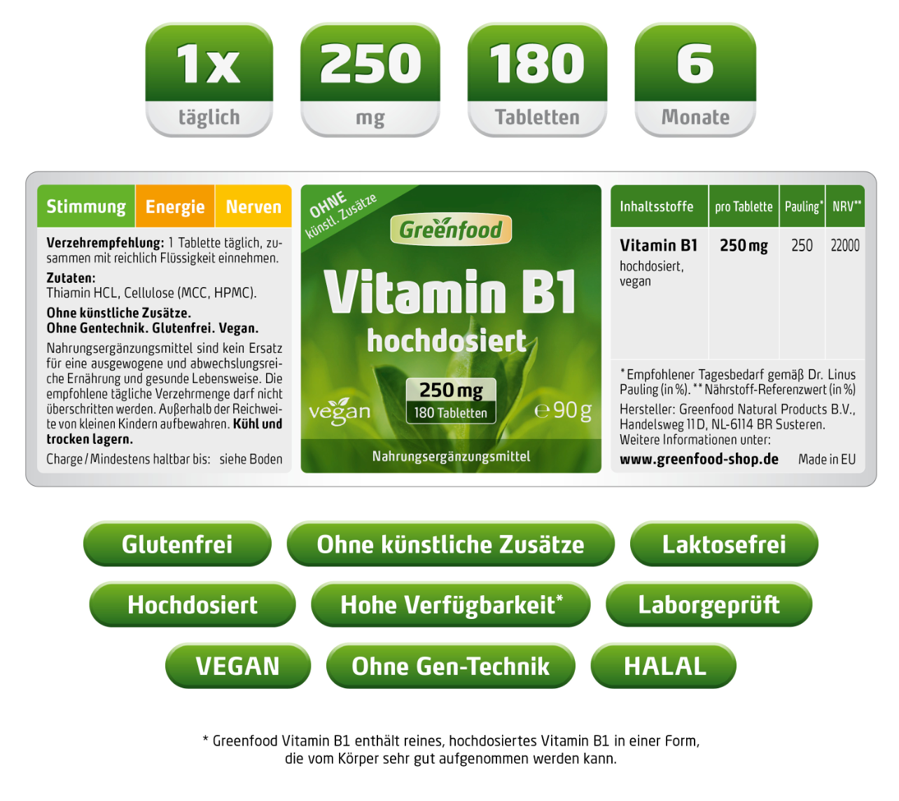 Vitamin B1, 250 mg, 180 kapsler, Greenfood