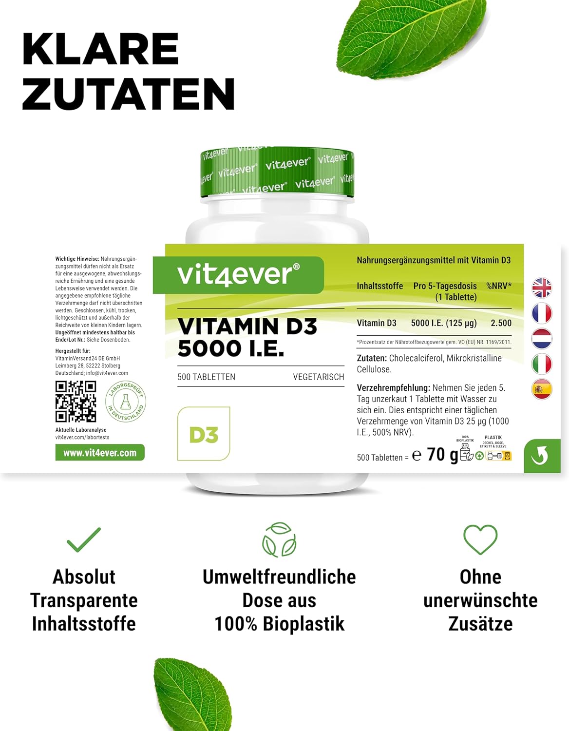 Vitamin D3, Depot 5000 I.E., 500 tabletter, Vit4ever